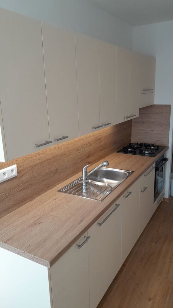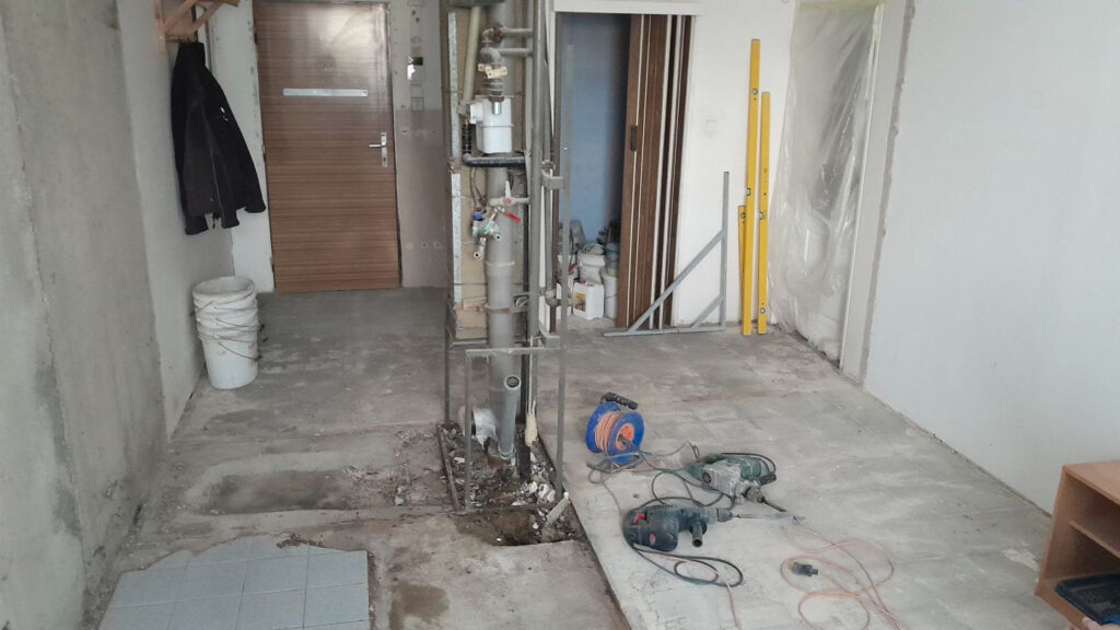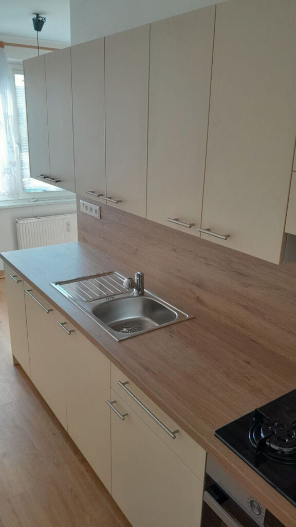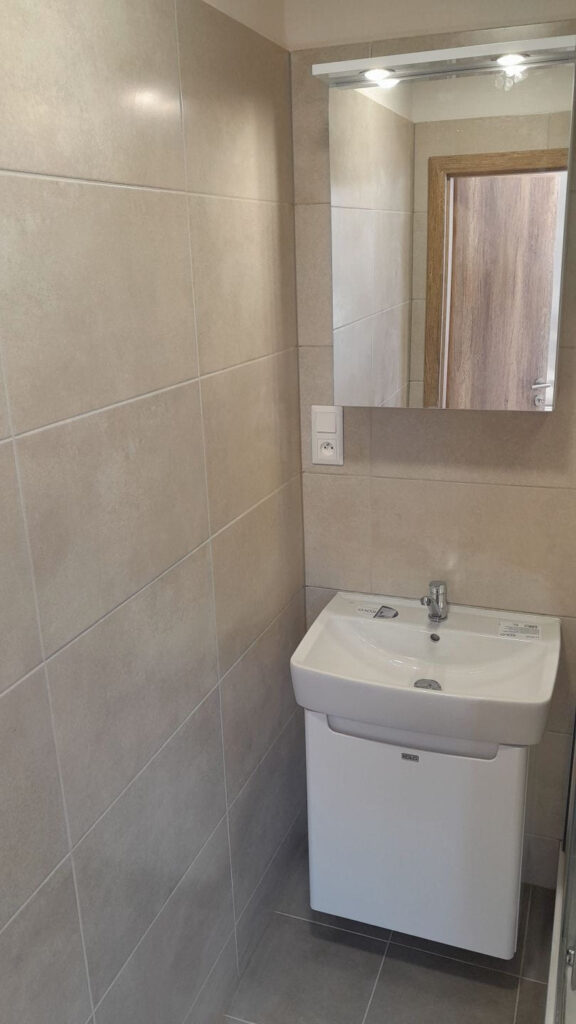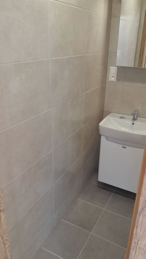 Kompletní rekonstrukce bytového jádra s úpravou stěn v chodbě a pokládkou vinylové podlahy.