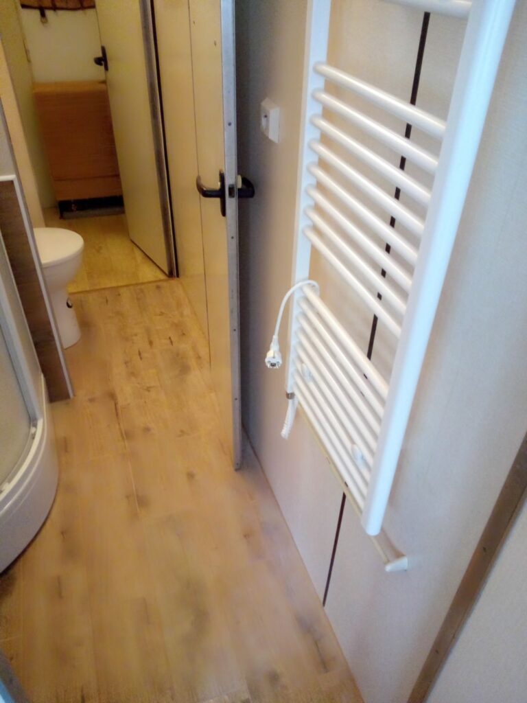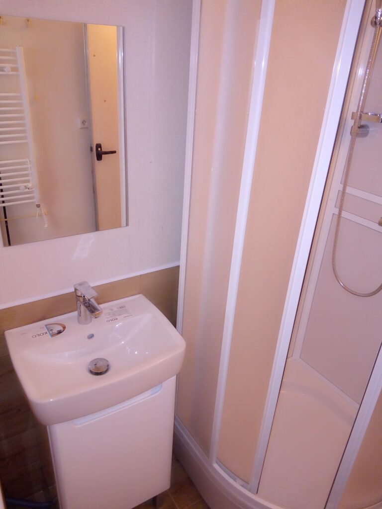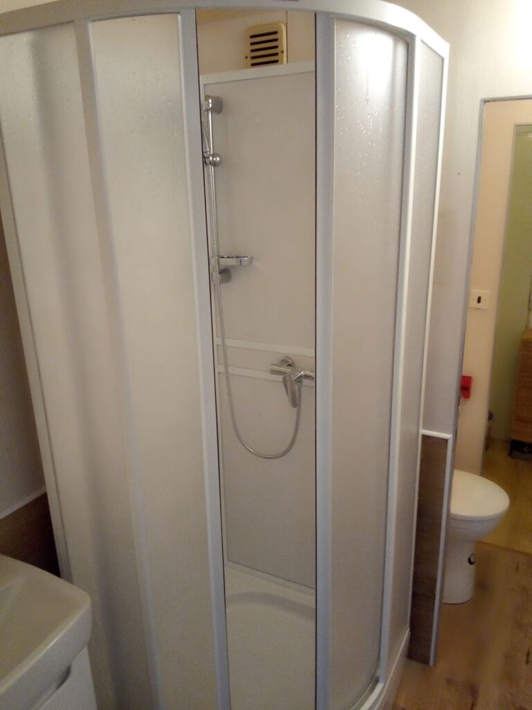 Levnější varianta rekonstrukce panelákové umakartové koupelny. Proběhla revitalizace umakartového jádra koupelny, do kterého byl namontován sprchový box. Koupelna byla dále vybavena pro dočasné použití.